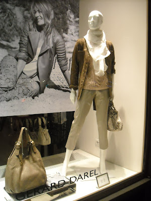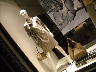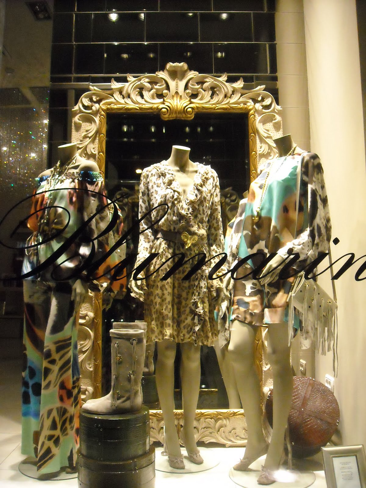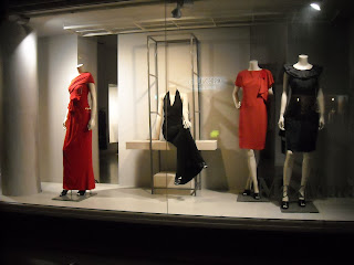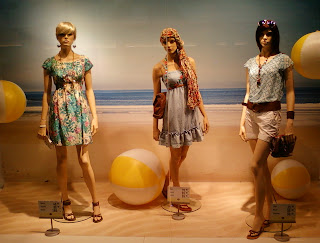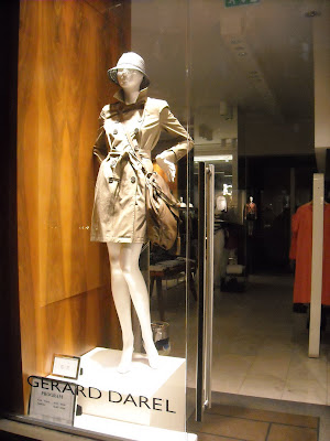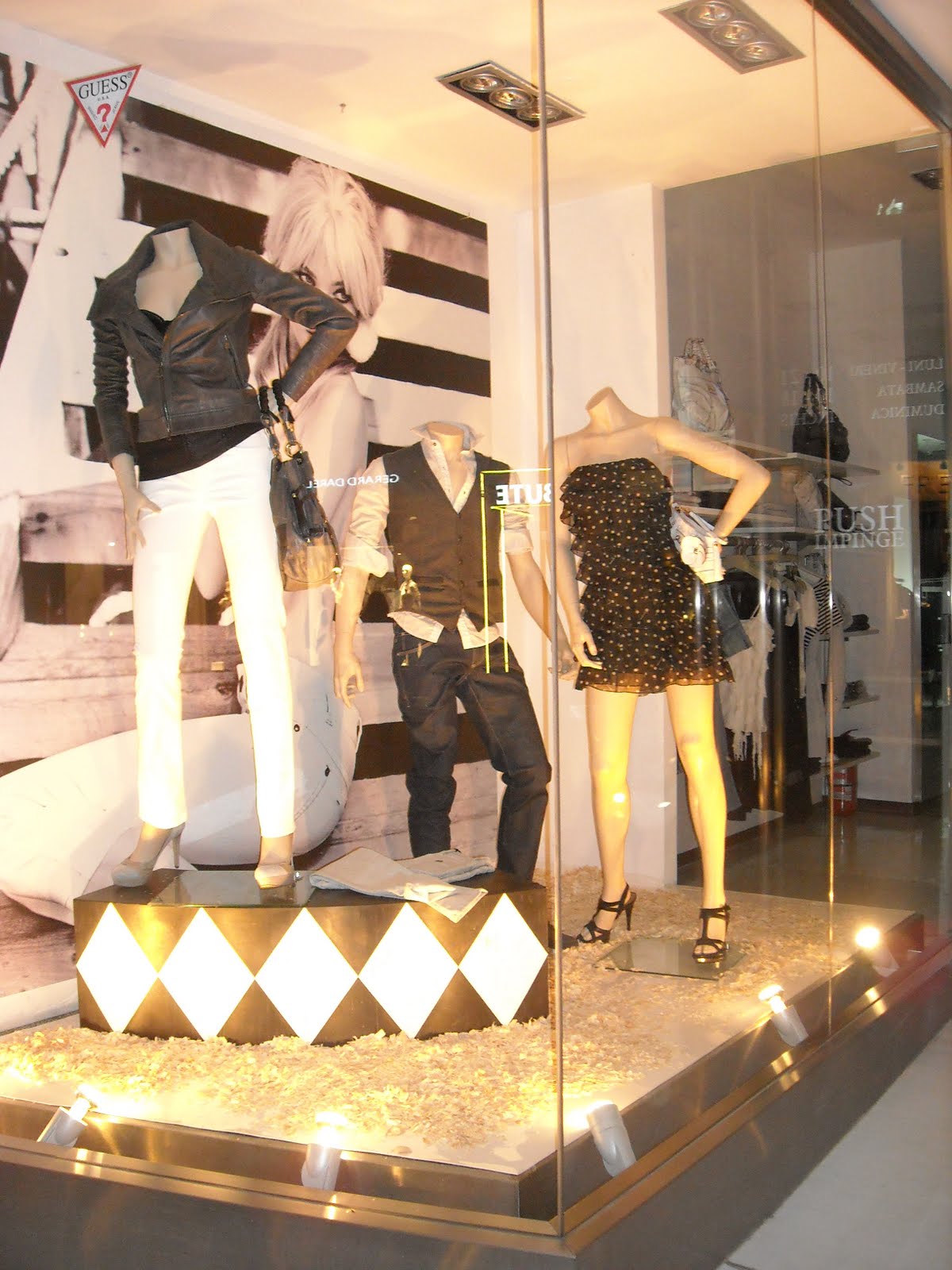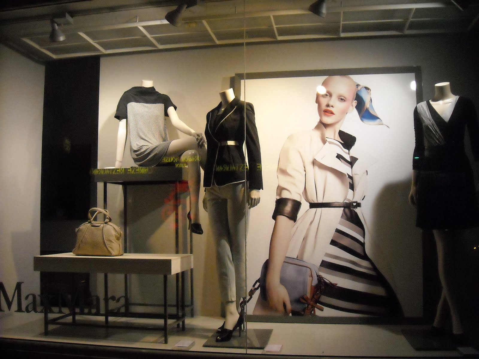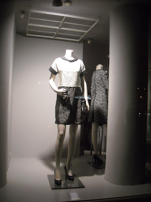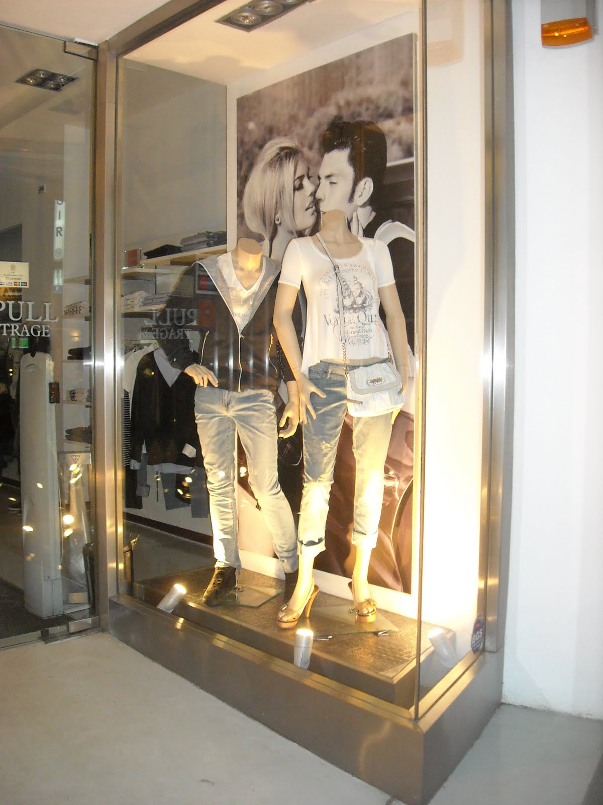 Vitrinele : deschise , cu manechini “headless” , iluminate corect . Recuzita şi accesoriile de vitrină (vezi scaunul şi rama) cataloghează clar clientela şi accesibilitatea acestui “concept store” .