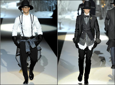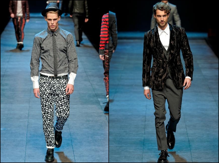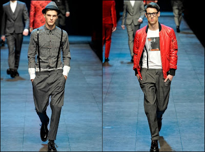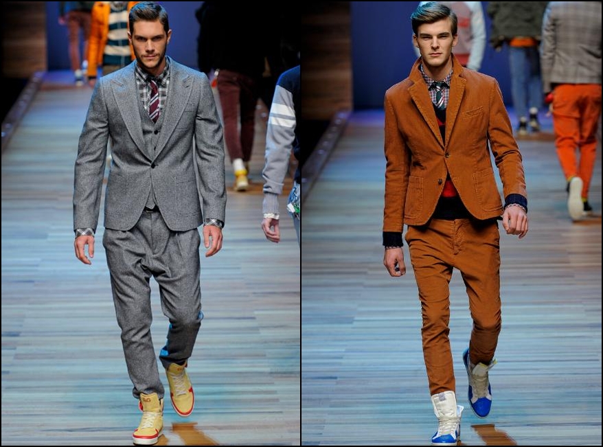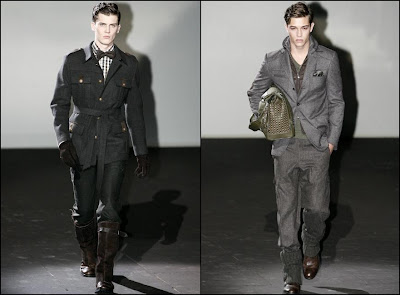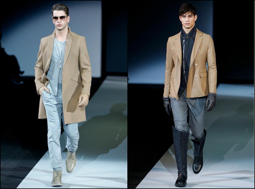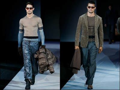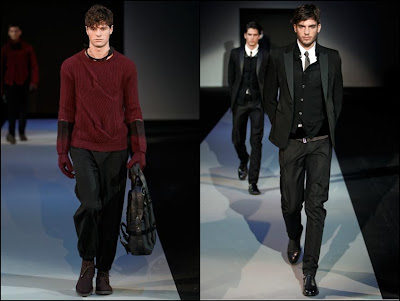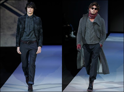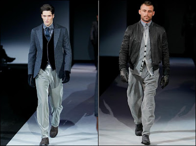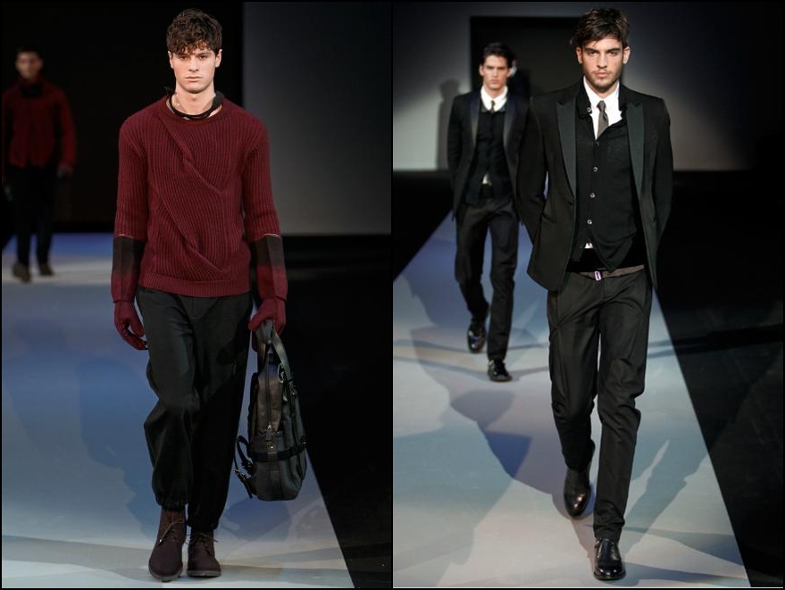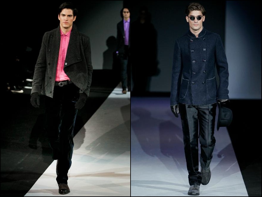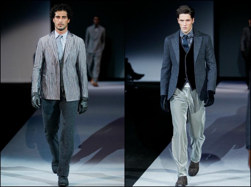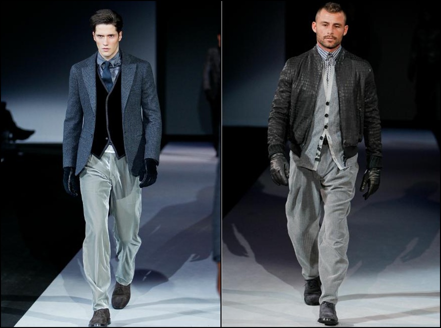 Giorgio Armani – un inovator prin definiţie , domnul Armani demonstrează şi în acest sezon că brandul Giorgio Armani şi-a câştigat clientela şi renumele pe bună dreptate : croieli clare , lejere , inspirate din anii ’40 cu influenţe milităreşti şi dandy. Culorile : gri (diferite nuanţe) , negru , maro , bleu .