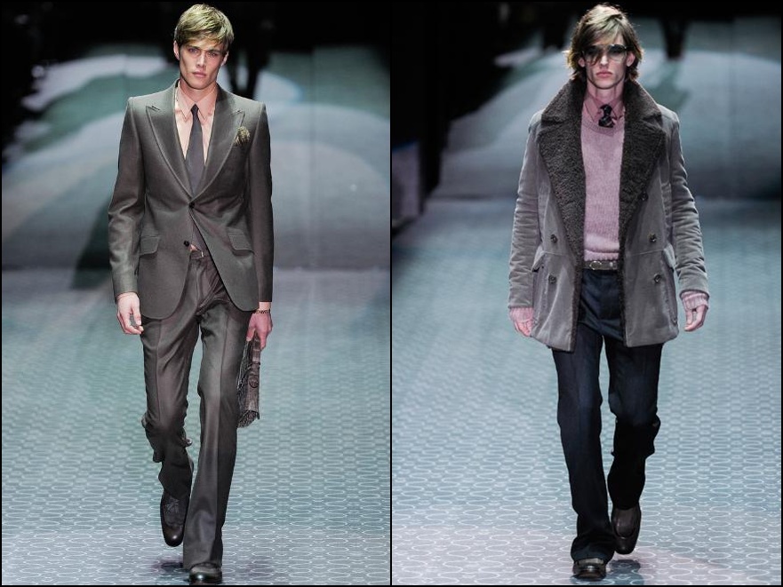 Gucci – creată parcă ca o extensie a colecţiei de Primăvară/Vară , colecţia Gucci pentru sezonul rece menţine în prim-plan trendul anilor ’70 : pantalonii trapezi , sacourile cambrate , culorile prăfuite ( roz murdar , maro , camel ) , pielea intoarsă de oaie , blană etc.