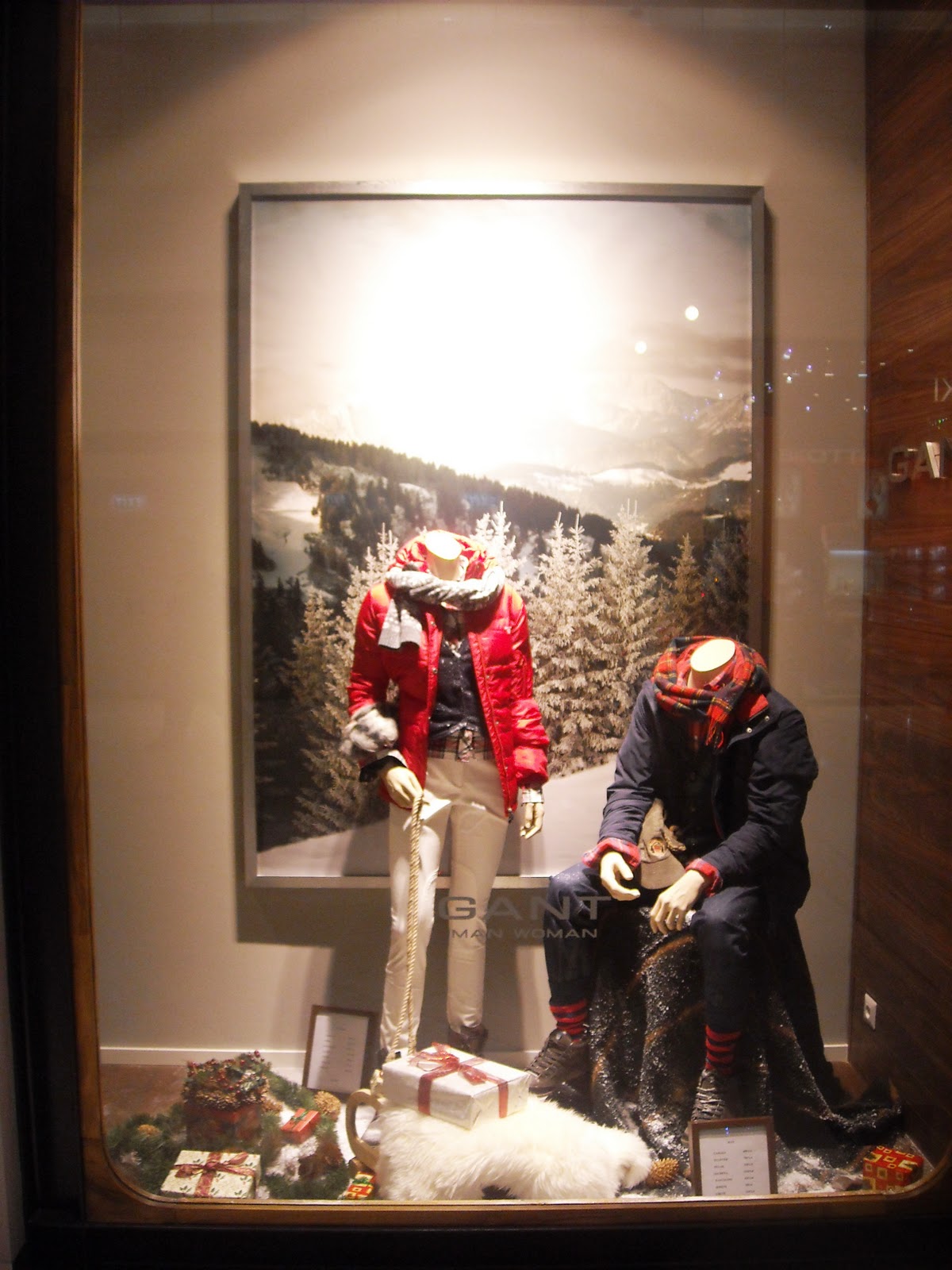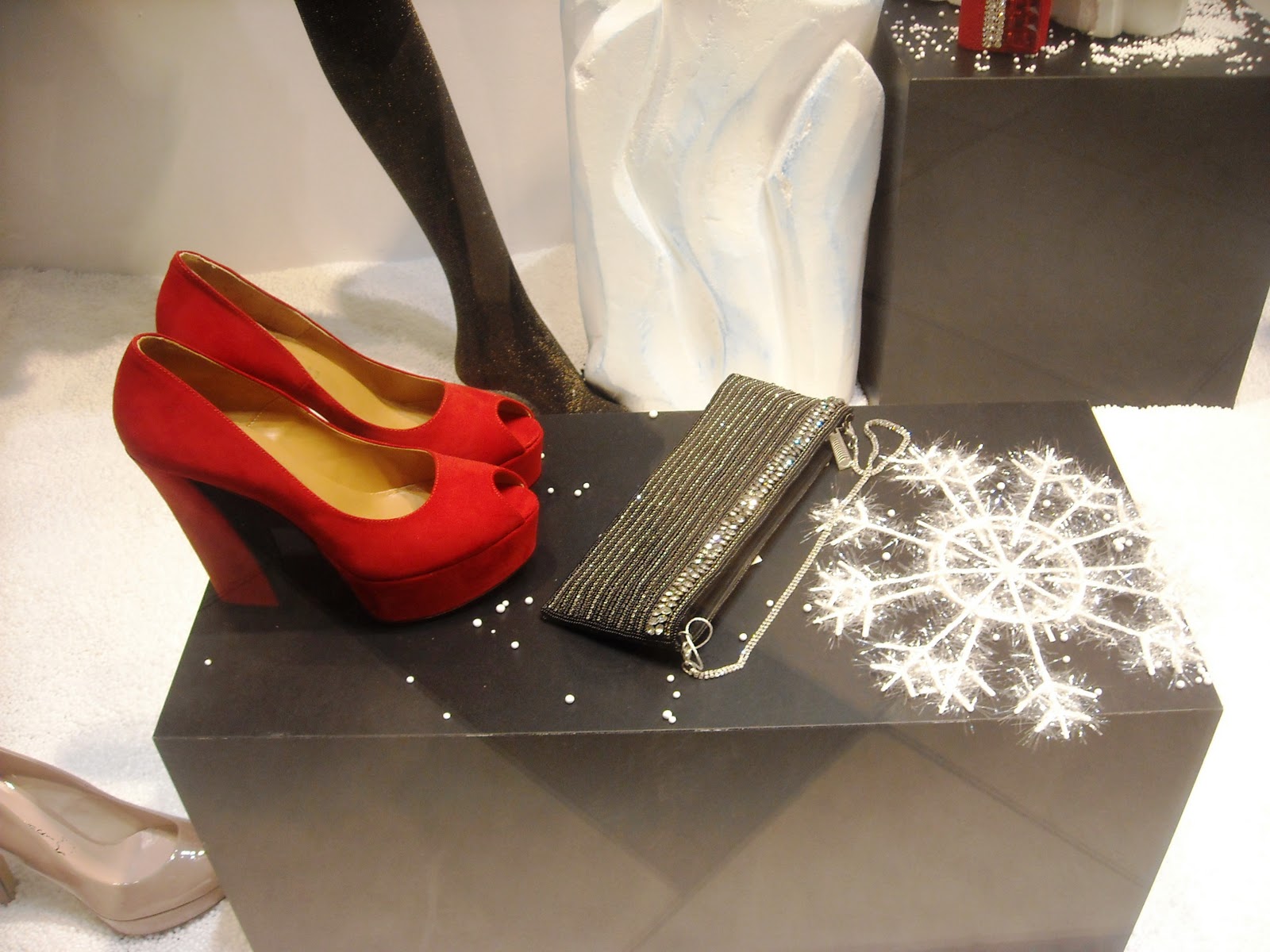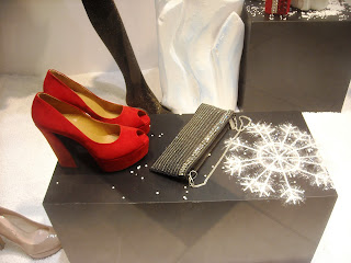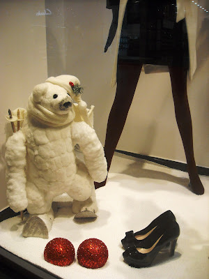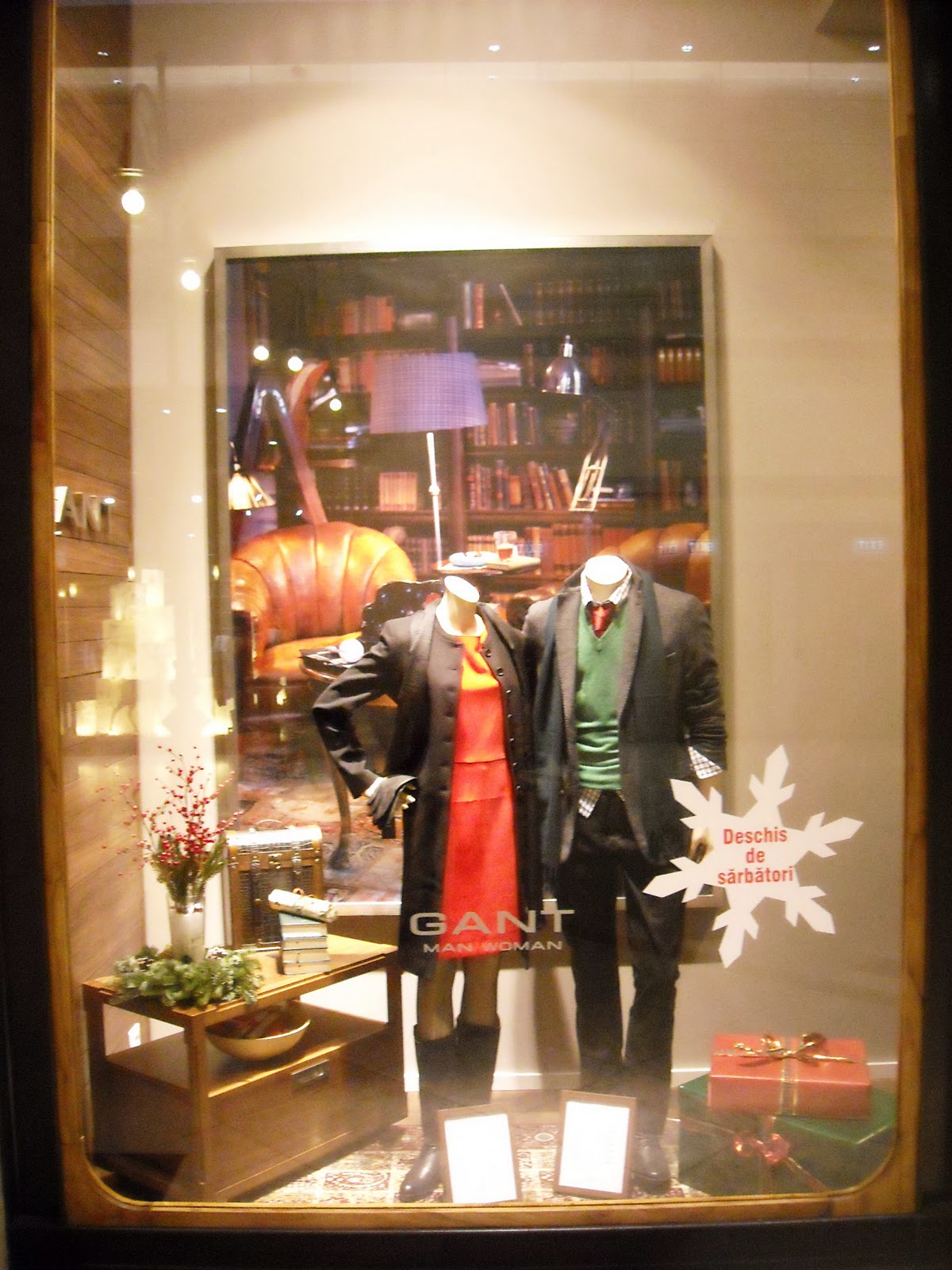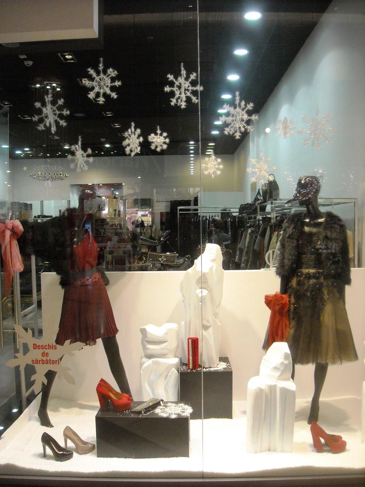 Îmi plac manechinii minimalişti, poziţiile lor, faptul că este semi-deschisă, că au decorat cu zăpadă artificială, styling-ul şi cromatica în tonuri de bej, roşu şi negru, recuzita de vitrină (mini-urşii polari, “bucăţile de gheată”, fulgii şi globuleţele).