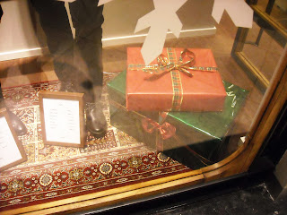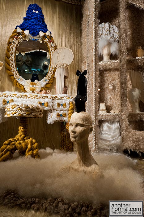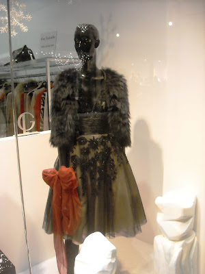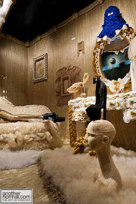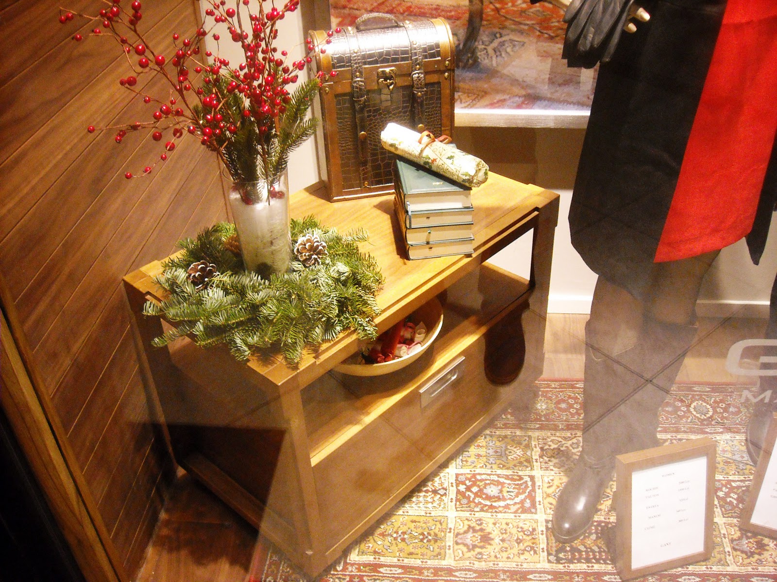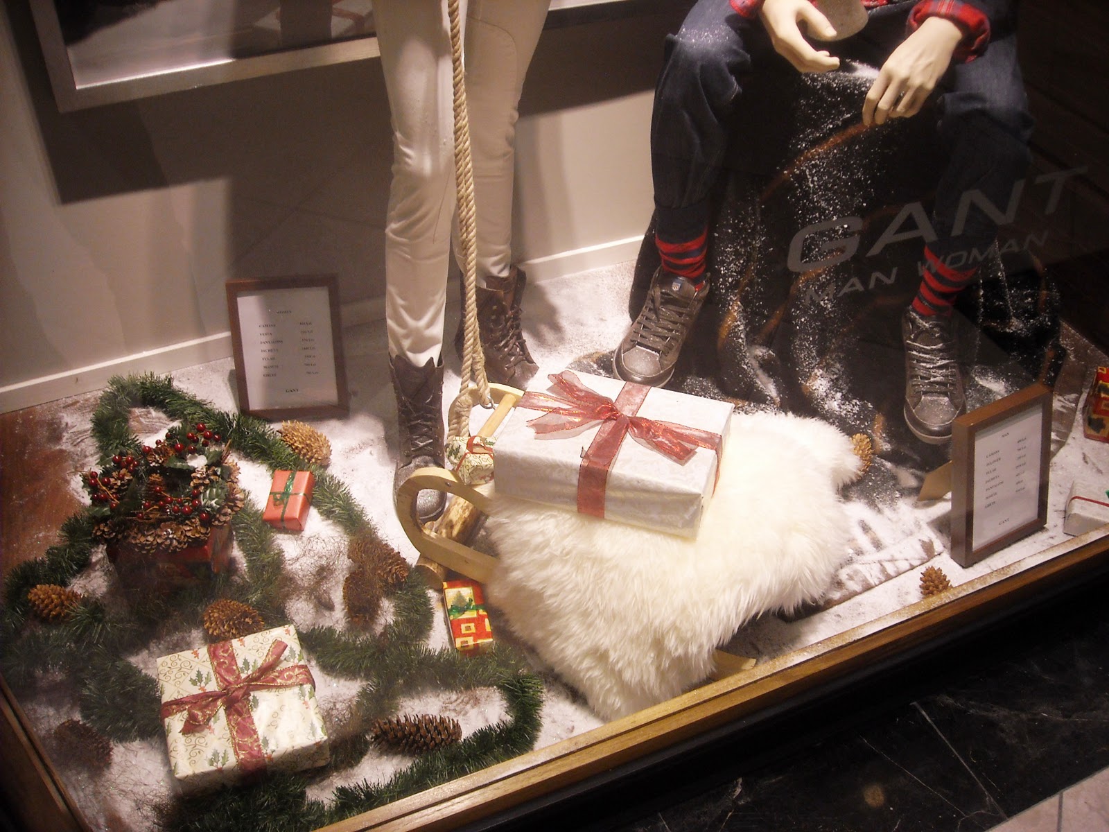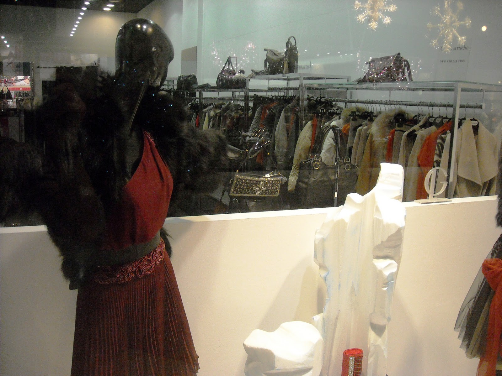Îmi plac manechinii minimalişti, poziţiile lor, faptul că este semi-deschisă, că au decorat cu zăpadă artificială, styling-ul şi cromatica în tonuri de bej, roşu şi negru, recuzita de vitrină (mini-urşii polari, “bucăţile de gheată”, fulgii şi globuleţele).