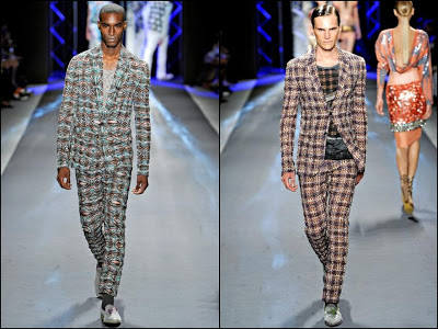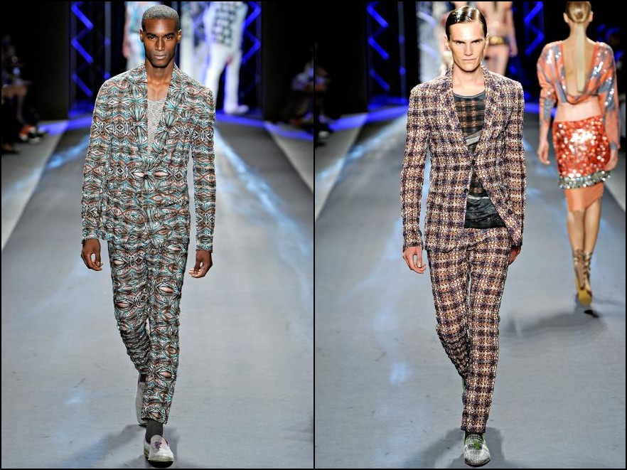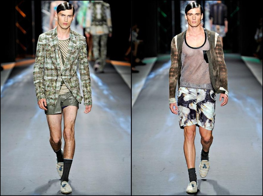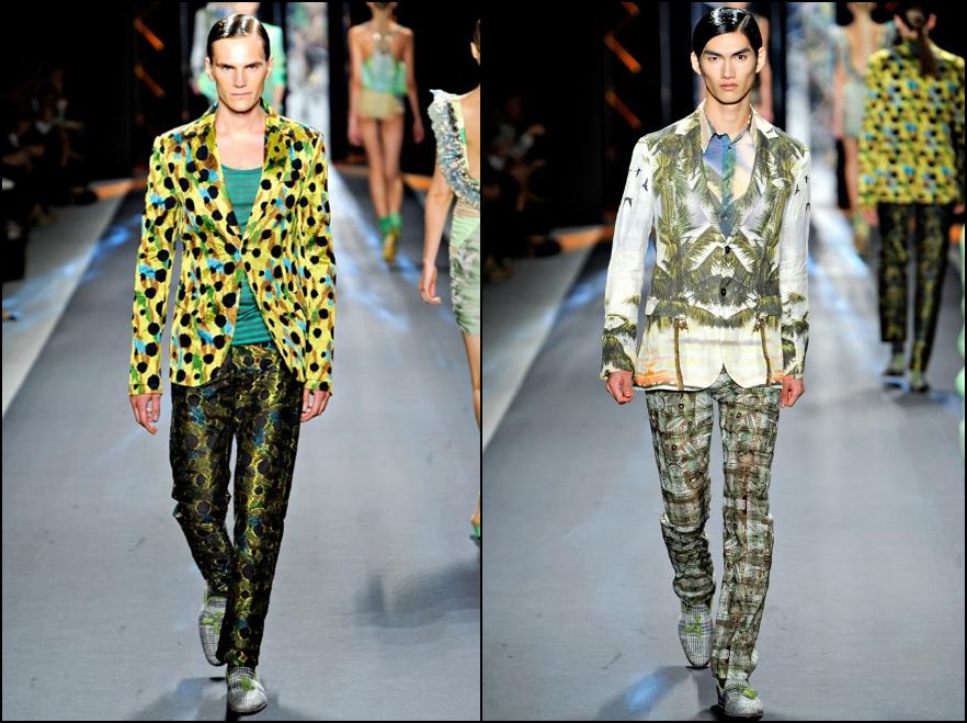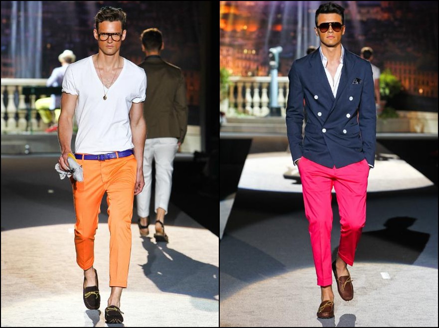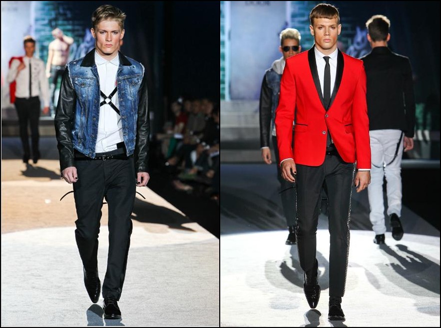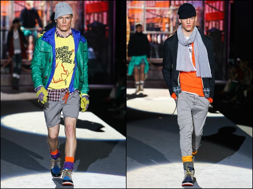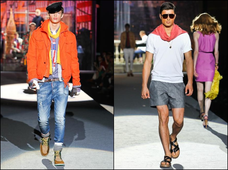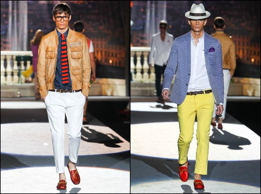 Dsquared2- bărbatul Dsquared2 din următorul sezon are cu siguranţă outfit-uri ideale pentru vacanţa de vară. Fie că vorbim de America, Scandinavia, UK , Grecia sau Italia el se poate distra în oricare dintre aceste locaţii, hainele fiind inspirate din outfit-urile “băieţilor răi” ai locului. Cromatica: alb, roşu, galben, portocaliu, verde fucsia şi negru.