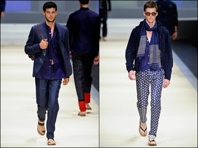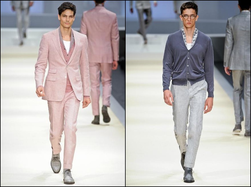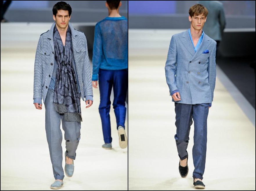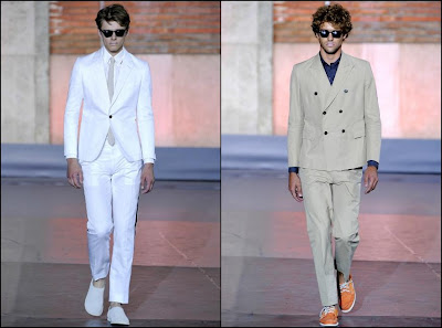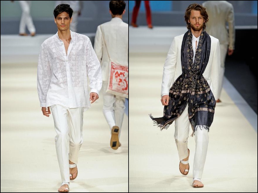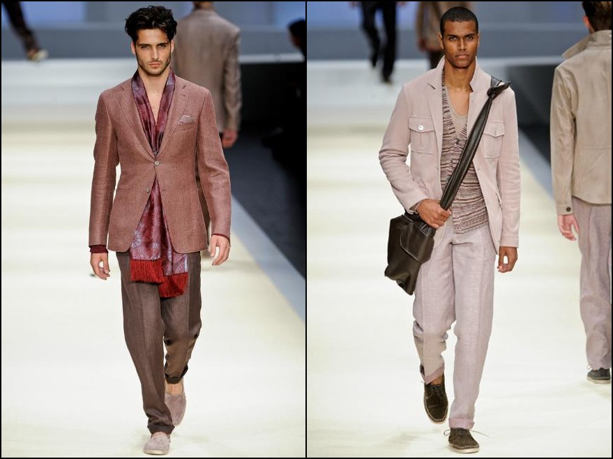 Canali– a demonstrat şi în acest sezon că nu-i întrece nimeni pe italieni când vine vorba de stil şi arta croitoriei. Colecţia pentru Primăvară/Vară 2012 este un omagiu adus Indiei şi ţinutelor ei: costume din fibre natrurale (bumbac, in, mătase), jachete deconstruite cu guler mandarin şi espandrile din împletituri de fibre sunt doar câteva dintre propunerile italienilor de la Canali. Culori: gri, roz, fucsia, turcoaz, portocaliu, verde smarald.