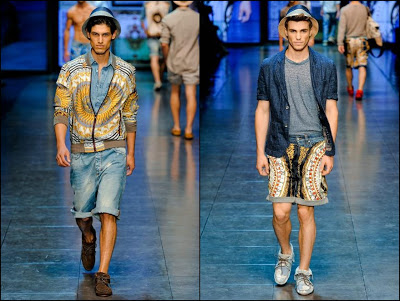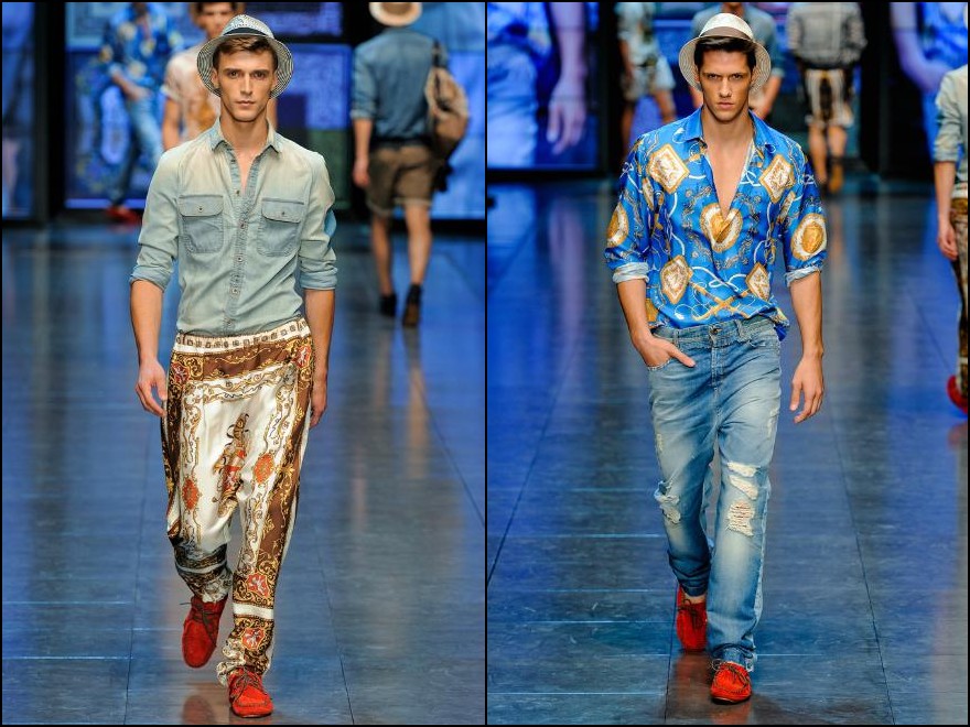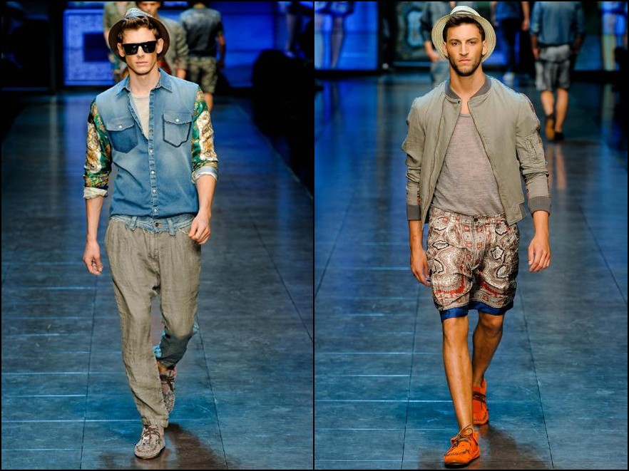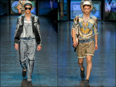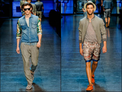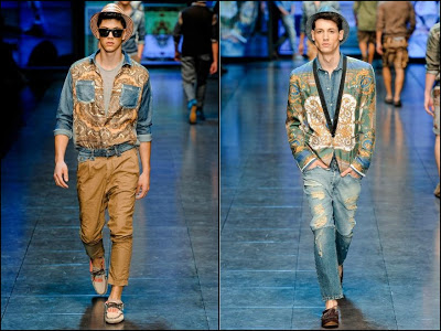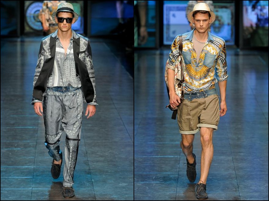 D&G- mare, soare şi lux la superlativ! Colecţia cuplului italian este o reîntoarcere la luxul secolului XVII, la Regele Soare şi la materialele preţioase de atunci. Imprimeuri batic pe tricouri, cămăşi şi pantaloni din mătase asortate cu piese din denim cu aspect uzat şi mocasini foarte lejeri- acesta este ultimul look “estival” marca D&G. Culori şi imprimeuri foarte îndrăzneţe: de la bleu, bej la la albastru, verde şi portocaliu.