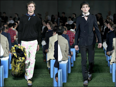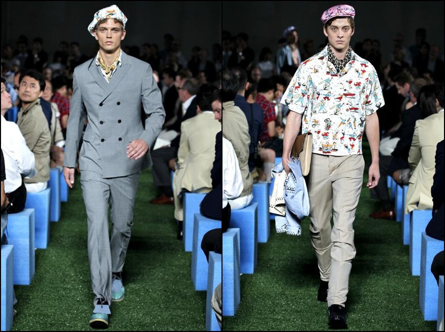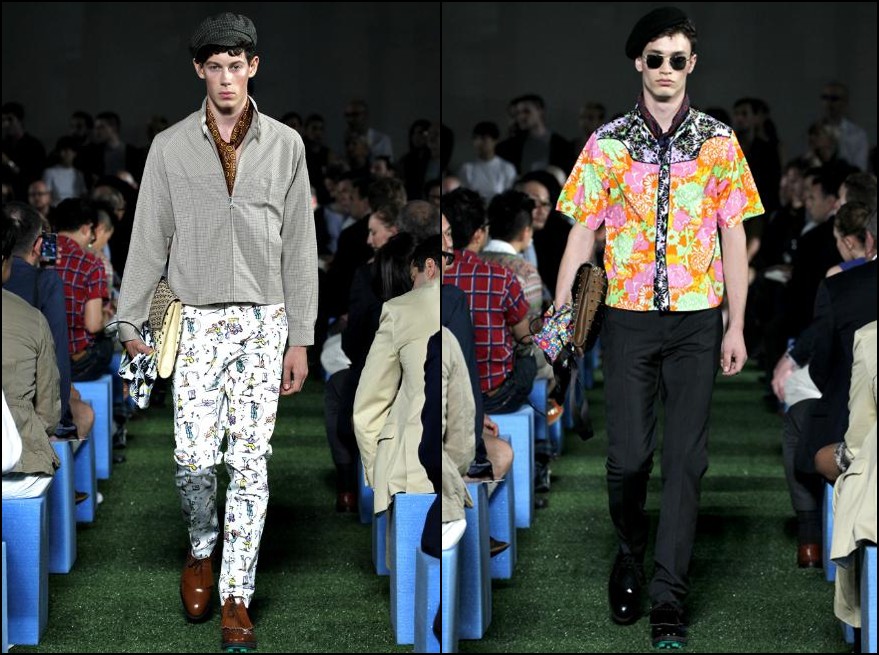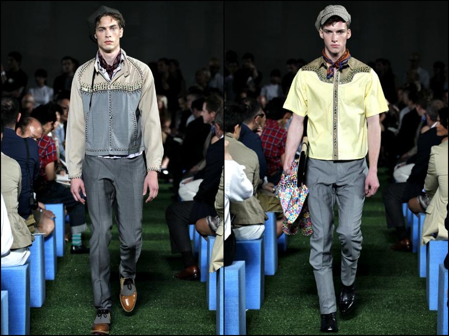 Prada- Miuccia Prada s-a inspirit în acest sezon din ţinutele bărbatului matur al anilor ’50 care după ce juca golf,se relaxa la un grătar în spatele casei. Outfit-uri americăneşti: cămăşi imprimate, pantaloni slim şi pantofi de golf.