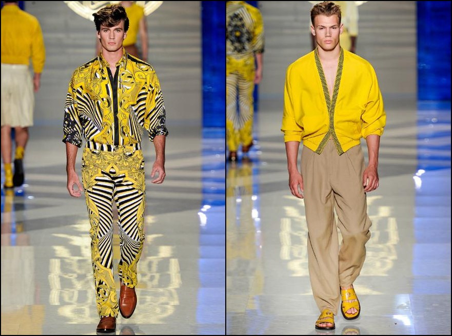 Versace- pantaloni cu pliuri şi talie înaltă, sacouri cu umeri laţi şi bermude strânse pe talie – acestea sunt piesele cheie ale colecţiei. Imprimeurile statement ale Donatellei sunt prezente şi acum. Culori: galben neon, albastru, roz, camel.