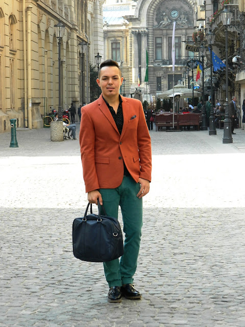Am creat ţinuta pornind de la sacou (binenţeles) şi dat fiind faptul că a fost o zi însorită, am colorat-o cu pantalonii, cămaşa şi batista.