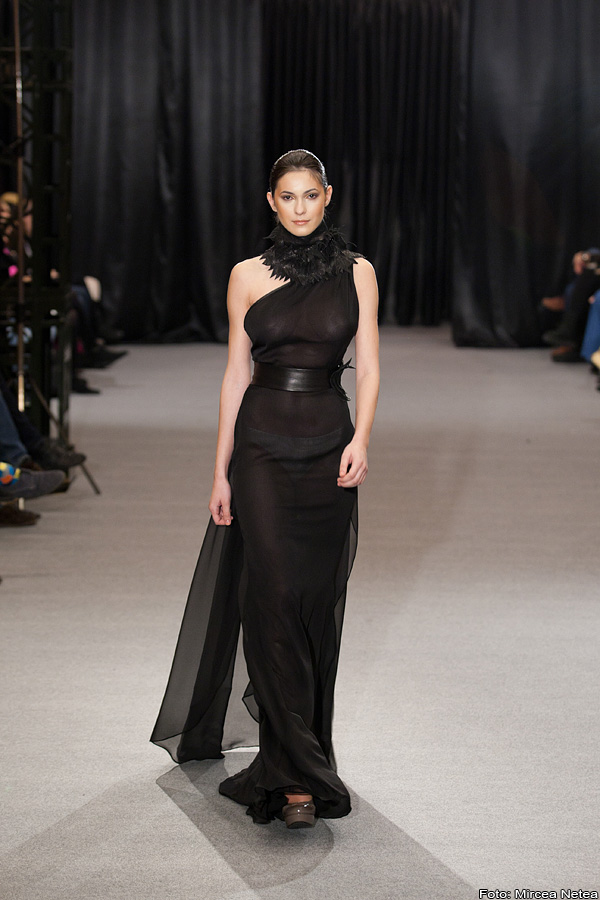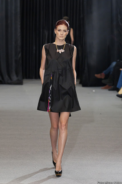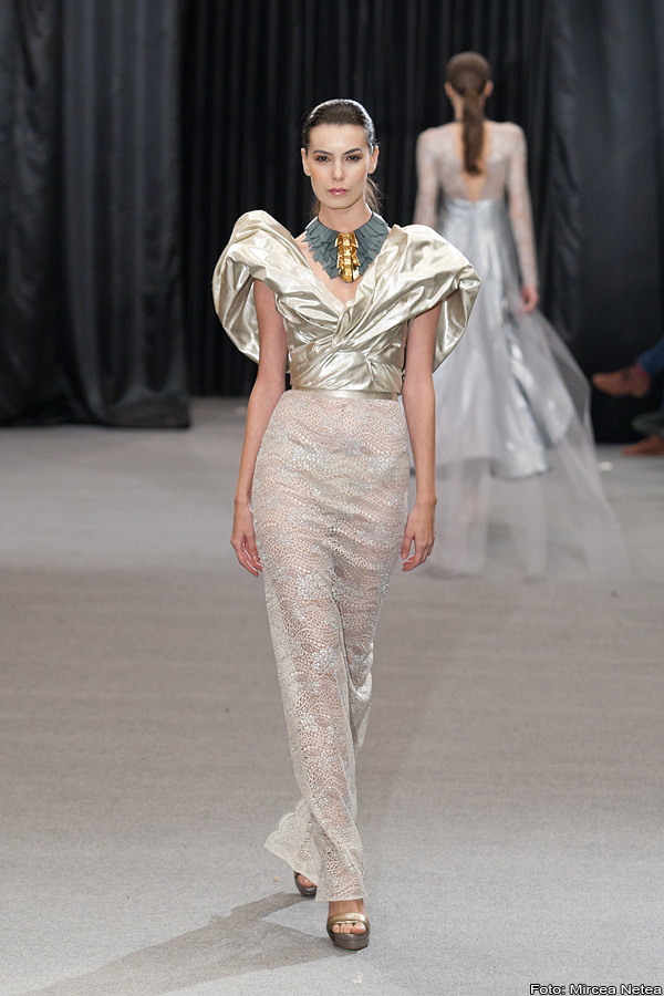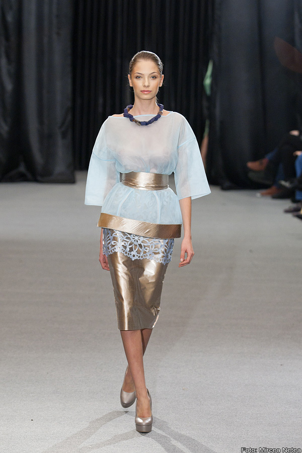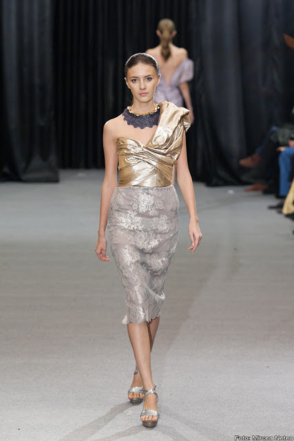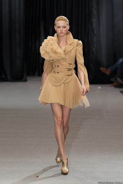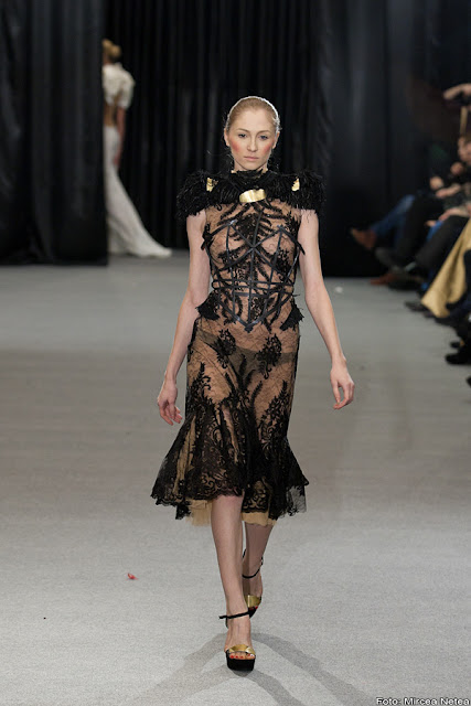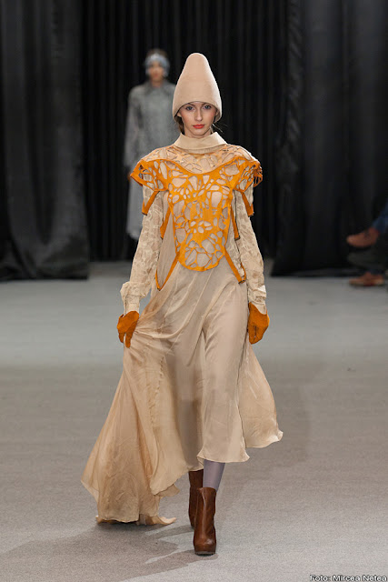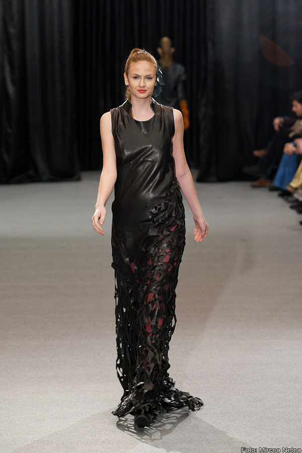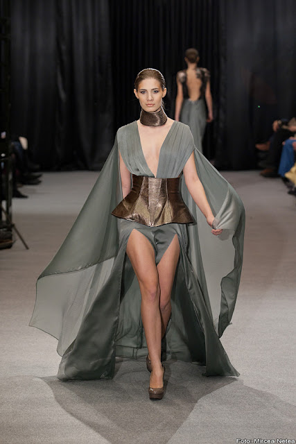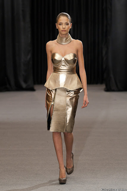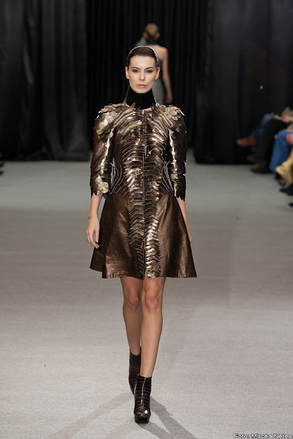 Anca și Silvia Negulescu - o colecție care pe mine m-a impresionat foarte mult. Mi-a plăcut cum “au sculptat” cei doi designeri în piele, cum au creat o feminitate parcă extraterestră. Dacă vorbim despre moda străzii, cred că ar putea deveni un IT-item corsetul-centură din fotografia a 5a (ușor stilizat).