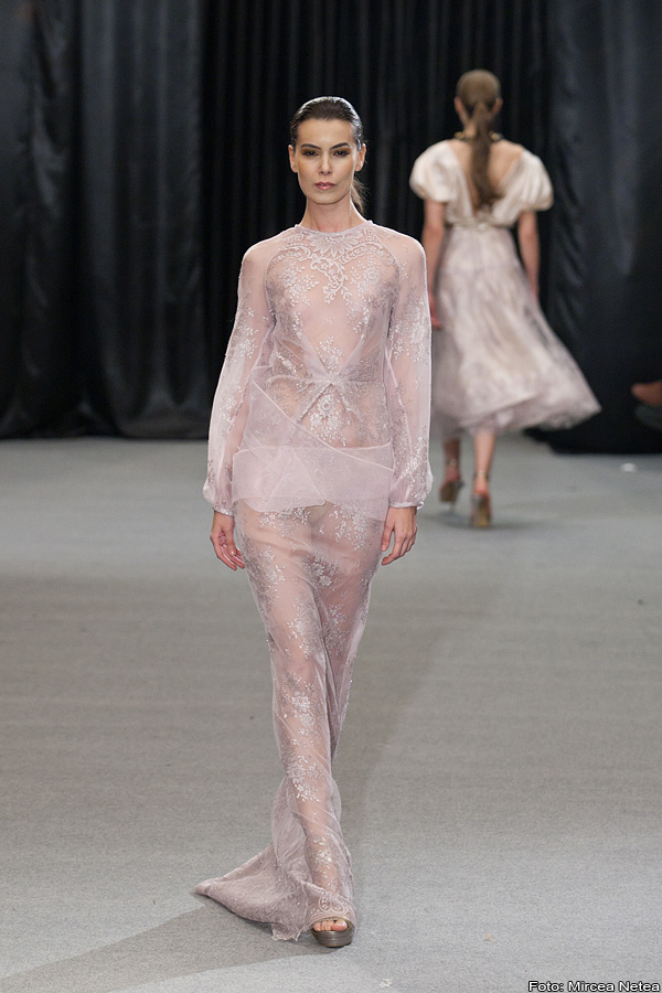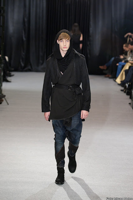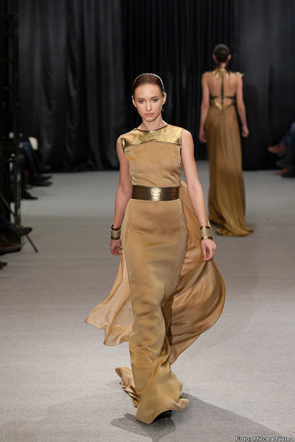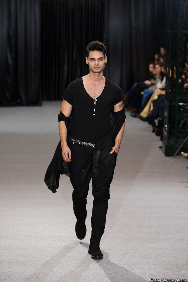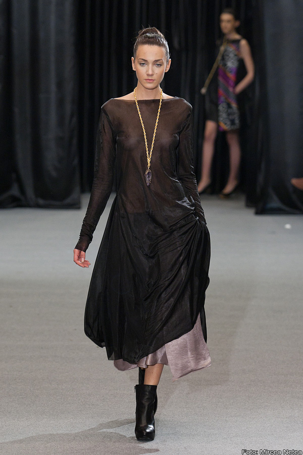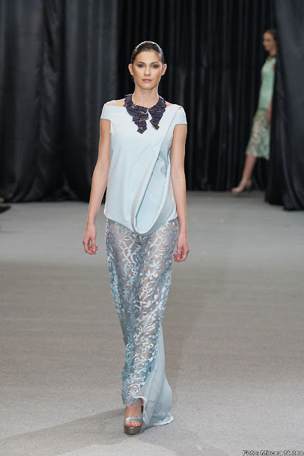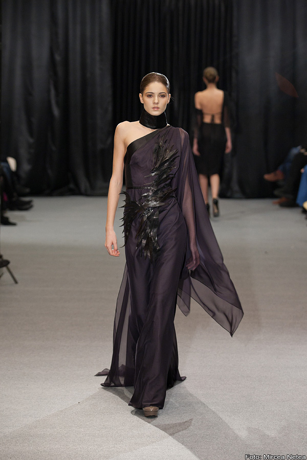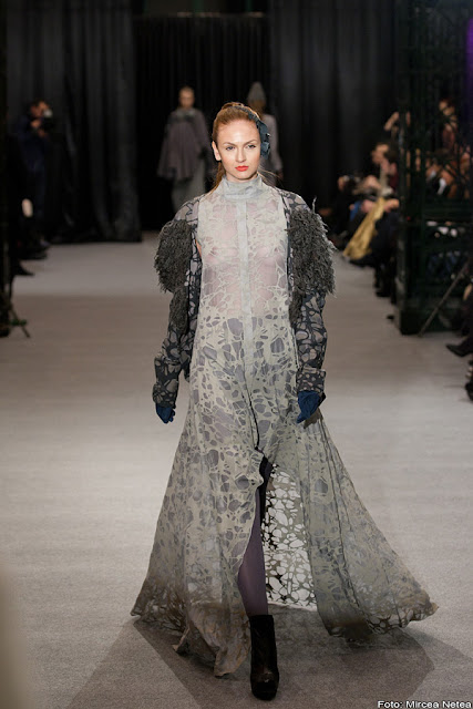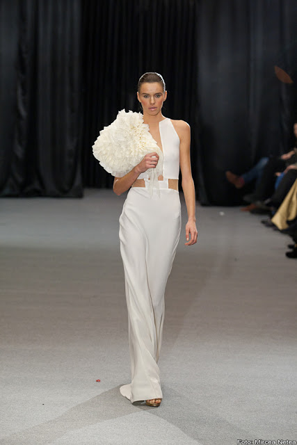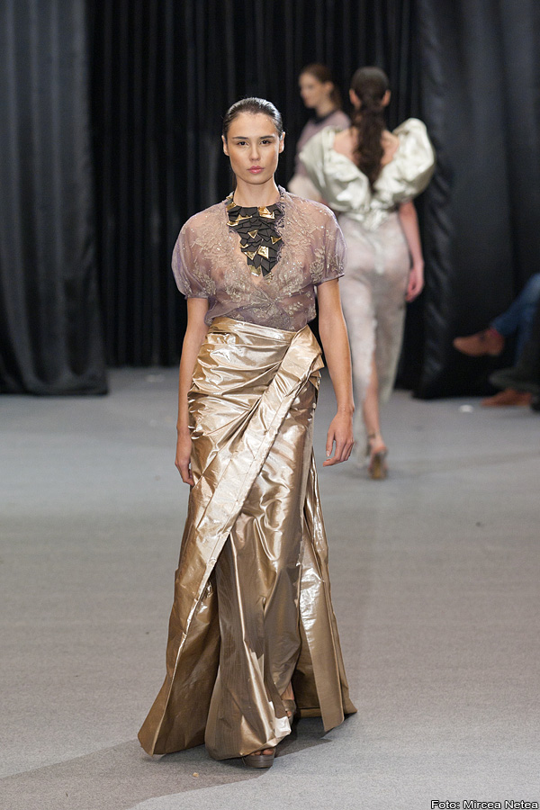 Anca și Silvia Negulescu - o colecție care pe mine m-a impresionat foarte mult. Mi-a plăcut cum “au sculptat” cei doi designeri în piele, cum au creat o feminitate parcă extraterestră. Dacă vorbim despre moda străzii, cred că ar putea deveni un IT-item corsetul-centură din fotografia a 5a (ușor stilizat).