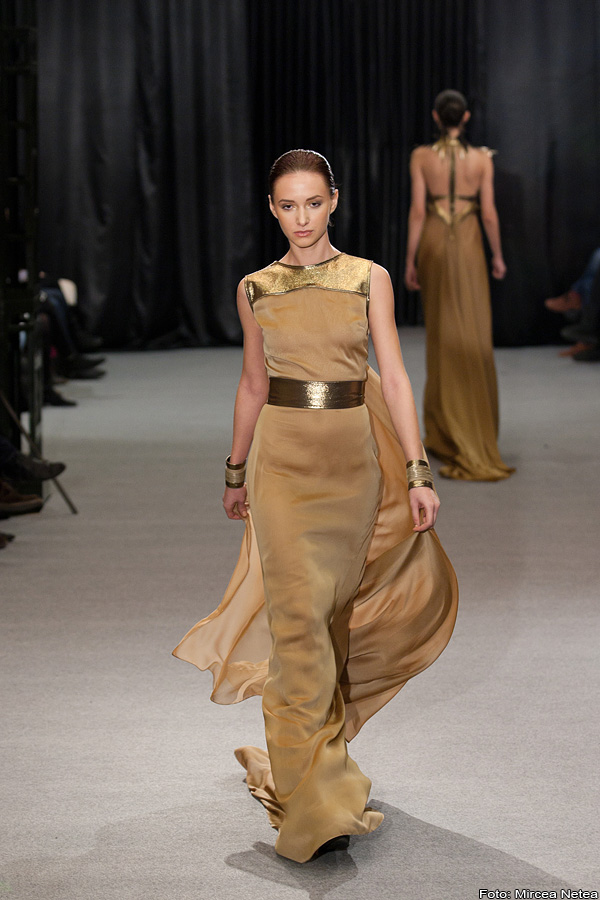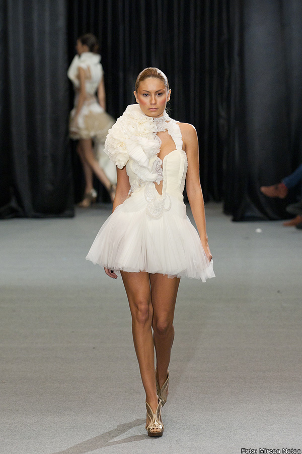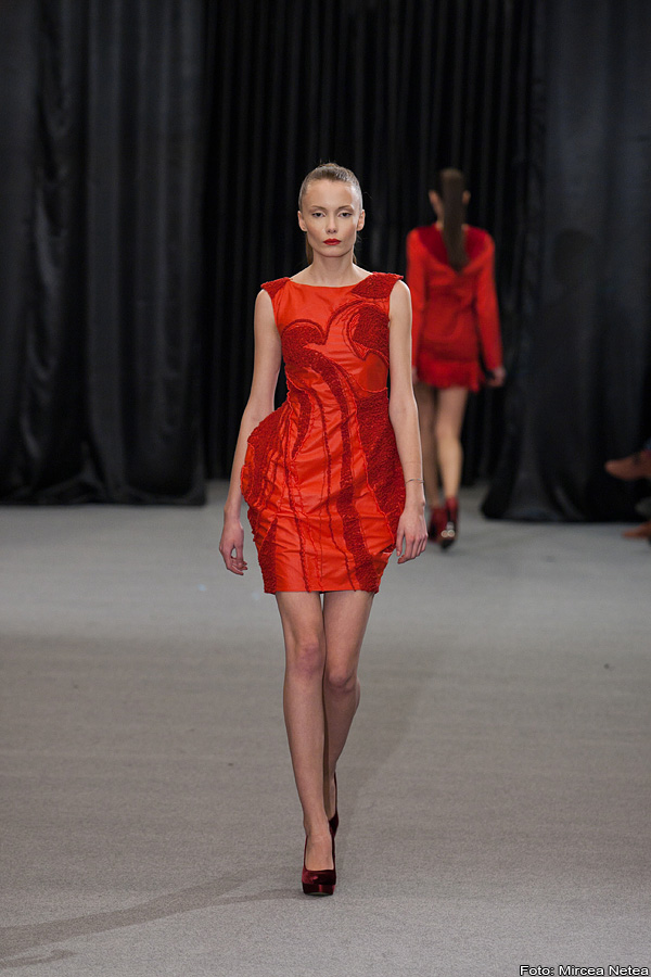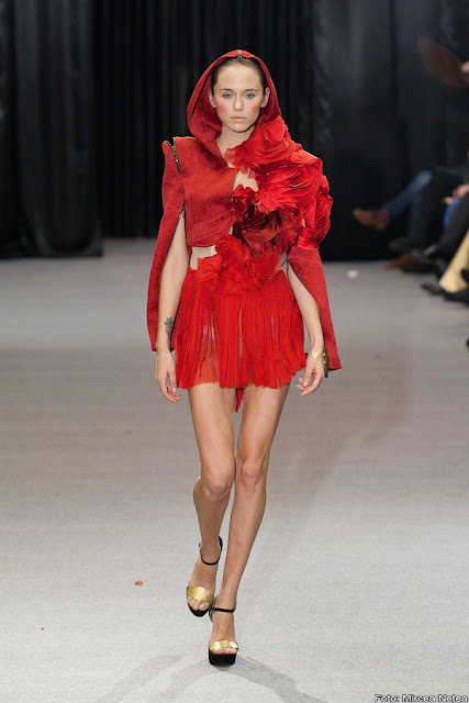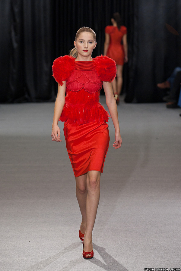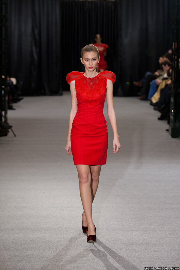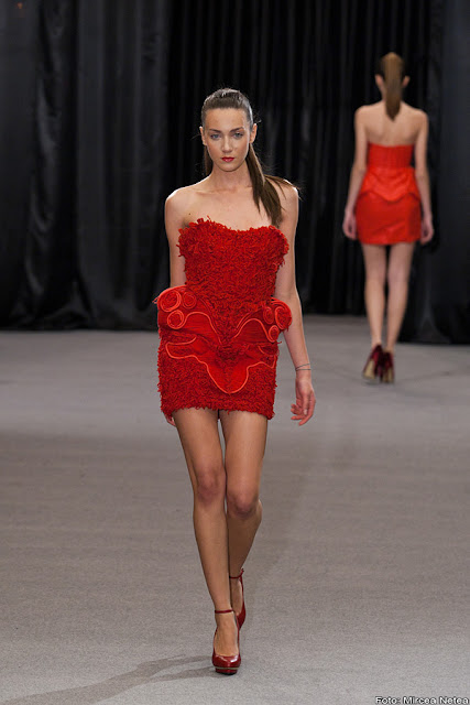 Loredana Novotini - la prezentarea Loredanei m-am teleportat oareșcum la un show Valentino, roșul acesta fiind atât de asemănător cu nuanța-etichetă a celebrei case de modă. Apreciez cu toată sinceritatea munca Loredanei și atenția cu care a realizat finisajele. Privită din latura consumatorului, colecția aceasta ar putea da naștere unui trend și anume: umeri pufoșii din a doua ținută, realizați în așa fel încât să poată fi atașați/detașați pe tricouri, bluze, rochii etc.