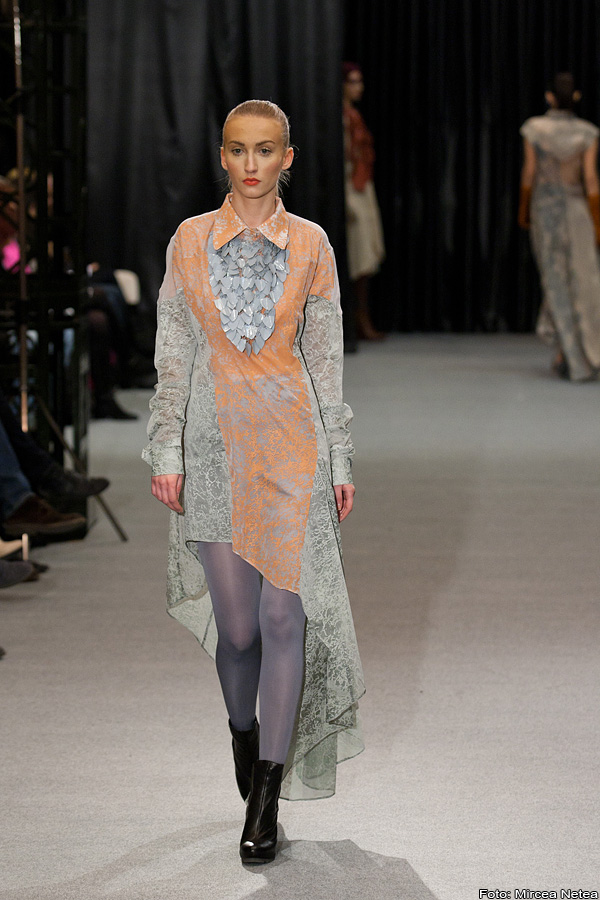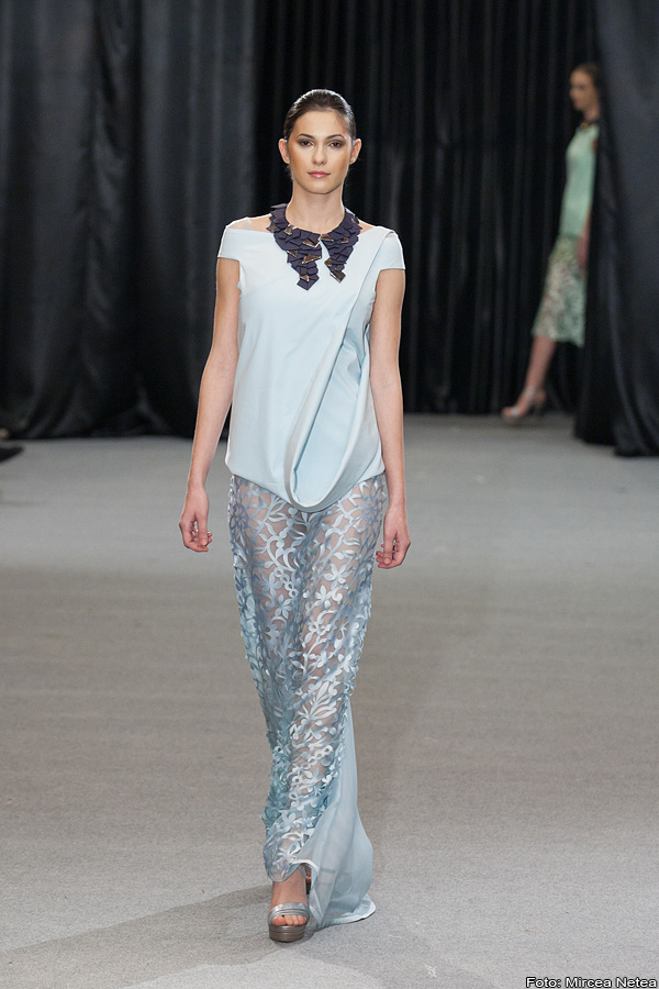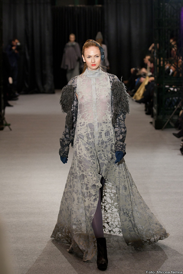 Carmen Cherecheș - decupajele pe care tânărul designer de la Cluj le promovează duc cu ideea la natura, la forța nevăzută care creează/distruge/recrează totul. Un potențial trend pentru mass-market este vesta din primul outfit.
